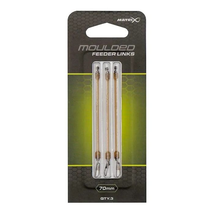 Matrix Moulded Feeder Links The Matrix Moulded Feeder Links feature a unique design which incorporates the swivel and link into a moulded stem. The design of this feeder link minimises any weak points or areas that your fishing line can get caught. Matrix have ensured that the stem of this feeder link is moulded from extremely durable plastic, so it can be used near obstacles with full confidence, but this plastic is also incredibly flexible which helps bite indication and casting. These feeder links are incredibly beneficial in feeder fishing as the plastic stem of the feeder link kicks your fishing feeder away from your hook length preventing tangles when both casting and reeling in. A trans khaki colour on these feeder links offers the perfect underwater camouflage across a range of bottoms including weed, silt and gravel. These Matrix Moulded Feeder Links are available in 40mm or 70mm lengths and are supplied in packs of 3 giving you plenty when fishing with multiple feeder rods.