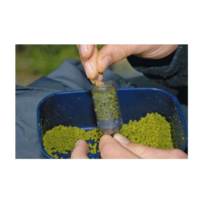 Om te gebruiken, bereidt u uw haakaas en lengte voor op de gebruikelijke manier - zoals u dat zou doen met een standaard methode voerkorf. Terwijl je dit doet, laat je de pellets naar keuze een paar minuten weken in water, zodat ze voldoende zacht worden en als je ze samenperst blijven ze aan elkaar plakken zonder dat ze hun vorm verliezen. Vul de Middy Shot-Gun Voerkorf met de pelletmix en steek je haakaas in de voerkorf zodra het iets meer dan halfvol is (hoewel je het vrij kunt laten hangen als je dat wilt, zullen de pellets zich op natuurlijke wijze perfect rond het haakaas verdelen wanneer het haakaas in de mix is ingebed). Vul de voerkorf volledig en druk het mengsel zo veel mogelijk in als je wilt. Hoe meer aas je inpakt, hoe langer het duurt voordat de voerkorf loskomt en het omgekeerde is ook waar - een lossere mix zal zich veel sneller verspreiden. Beide methoden leveren fantastische resultaten op en de keuze van het te gebruiken aas is eenvoudigweg afhankelijk van de omstandigheden op de oever en de voederactiviteit van de vis.