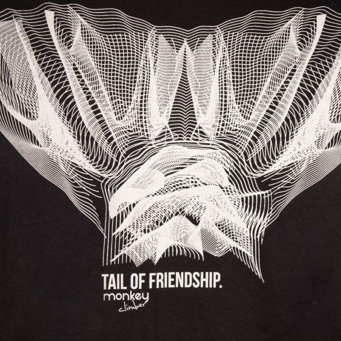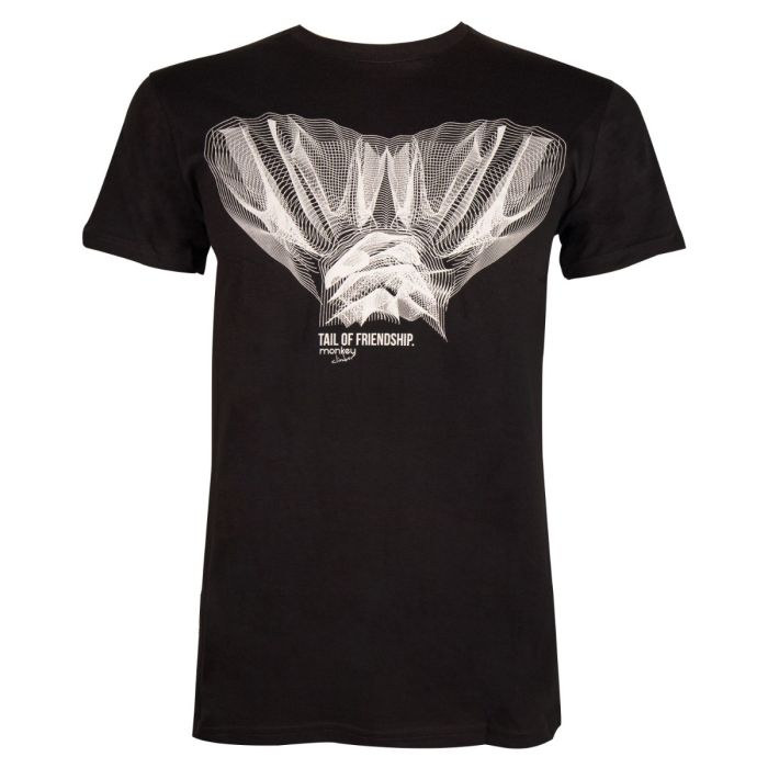 De röntgenfoto van de staart van de karper geeft niet alleen de relatie tussen mens en vis weer, maar ook de verhalen en vriendschappen die in de sport worden gemaakt vandaar de gedrukte 'Tails of Friendship'. Dit shirt is representatief voor een van de belangrijkste attracties van het karpervissen voor veel vissers.
