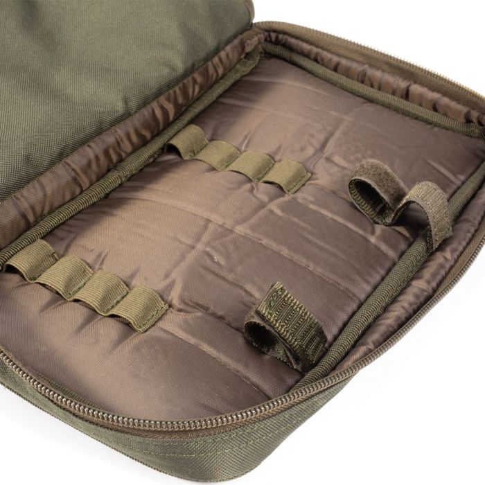 Gevoerde centrale verdeler, plus elastische lussen om tot vier 12 inch (30cm) banksticks op te bergen en een gaasvak met rits voor indicatoren.