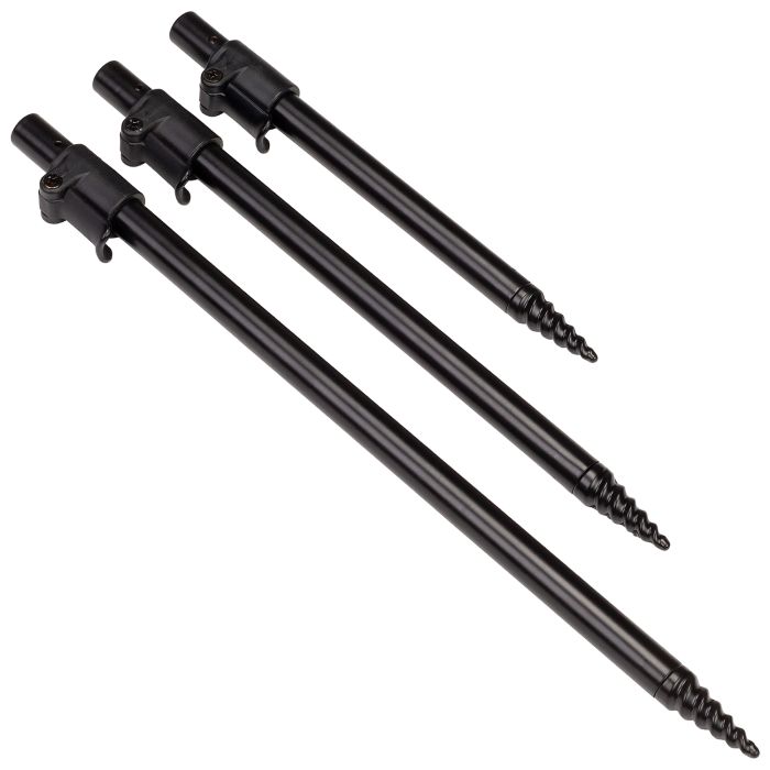 Matzwarte oeverstokken met de beproefde hoge sterkte gependelde boorpunt voor harde ondergrond. Met een vergrote nokvergrendeling voor gebruiksgemak in alle weersomstandigheden en bij nat weer, en een veilige, niet draaiende vergrendeling dankzij het gegroefde binnenste gedeelte.