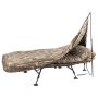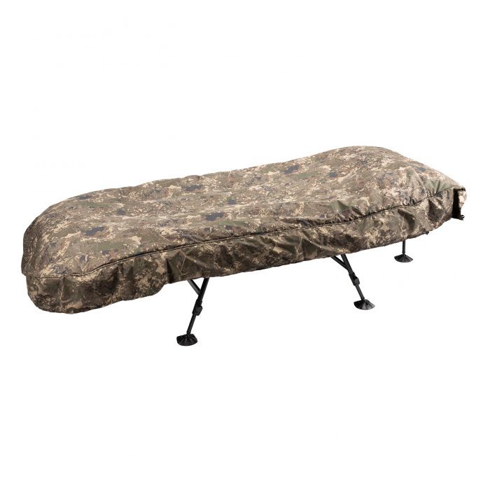 Het materiaal van de kleed is afgewerkt met een camopatroon dat past bij de rest van uw karperbagage en is gemaakt van stof met een waterdichtheid van 5000 mm, dus als u er volledig gekleed en nat van de regen op slaapt, zal het de rest van uw slaapsysteem niet verpesten.
