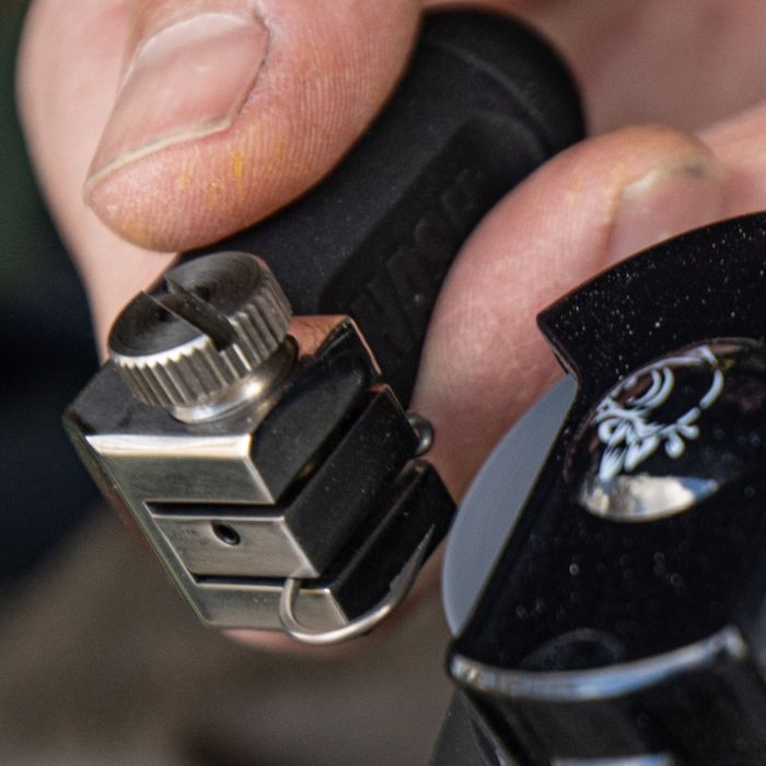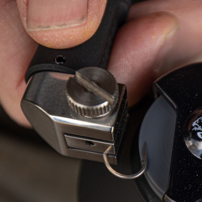 Essentieel voor volledige precisie en controle bij het gebruik van de Haak Dokter, is dat de speciale Haak Dokter Bankschroef de haken stevig vasthoudt en ze in de optimale hoek presenteert voor het klinisch slijpen met de Haak Dokters draaiende steen. Ergonomisch ontworpen om in de hand te passen, met een afgeronde basis en een in drie stappen verstelbaar behuizing om het comfort voor elke gebruiker te garanderen. De Haak Dokters beveiligde duimschroef bankschroef zorgt er ook voor dat de haken niet kunnen worden uitgeworpen door de draaiende steen om een gevaar te worden op de oever of thuis.