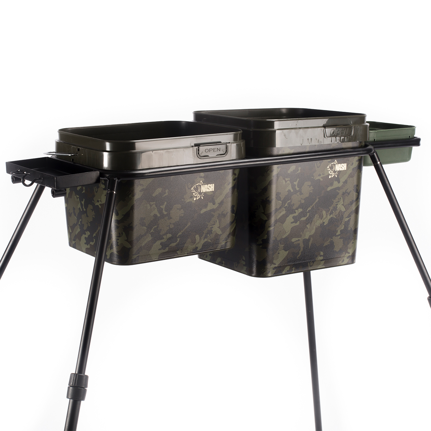 Aan de andere kant accepteert een gevormd kader perfect een aasdoos om kant en klare voerzakken of -stokken te houden, of biedt een plaats om water te houden om de consistentie van je spodmix te behouden, of eenvoudigweg om je handen te wassen na een zware sessie.