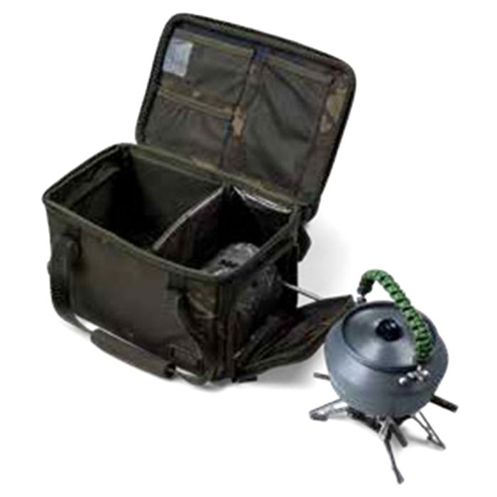 The Nash Subterfuge Brew Kit Bag is designed to take all your tea and coffee essentials including a kettle and stove. With a stiff walled construction and fully fold flat inner central divider with a ⅓ foil lining to keep a bottle of milk cool. With three zip pouches under the lid ideal for separate sachets and elasticated loops for teaspoons.