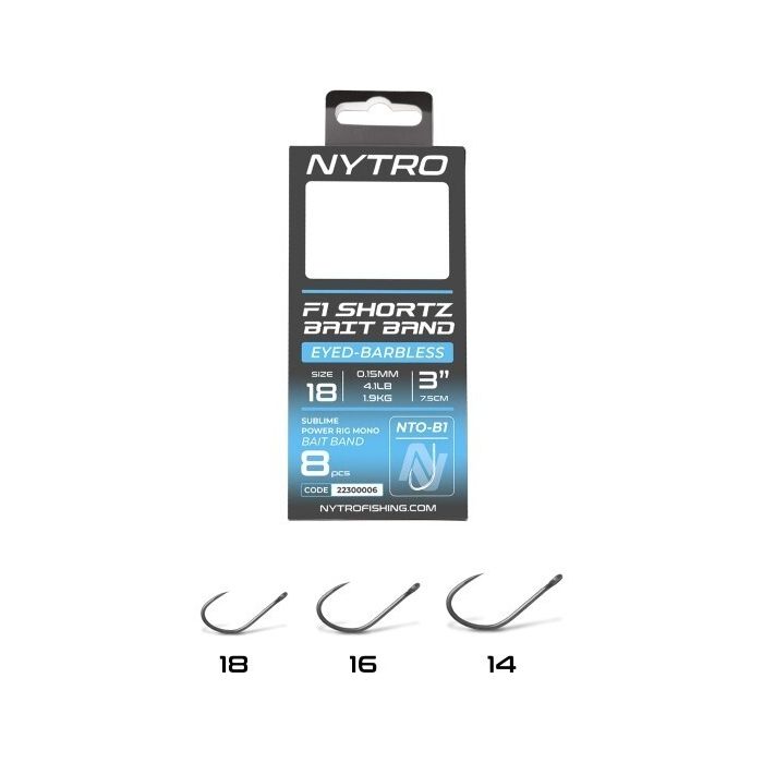 Nytro NTO-B1 Barbless F1 Shortz Bait Ready Tided Rigs, NTO-B1 Barbless F1 Shortz 3 Inch/7.5cm Latex Bait Band Hooks to Nylon Designed specifically for commercial venues, the Nytro F1 Shortz Bait Band Hooks to Nylon are ideal when targeting F1s and silverfish using feeder tactics. Each rig is fitted with a durable latex bait band and tied at a short 7.5cm length, ensuring quick, accurate bait presentation with wafters or hard pellets. Constructed using Sublime Power Rig Mono and equipped with the barbless NTO-B1 Extra Wide Gape Strong hook, these rigs deliver consistent strength and performance right out of the packet.