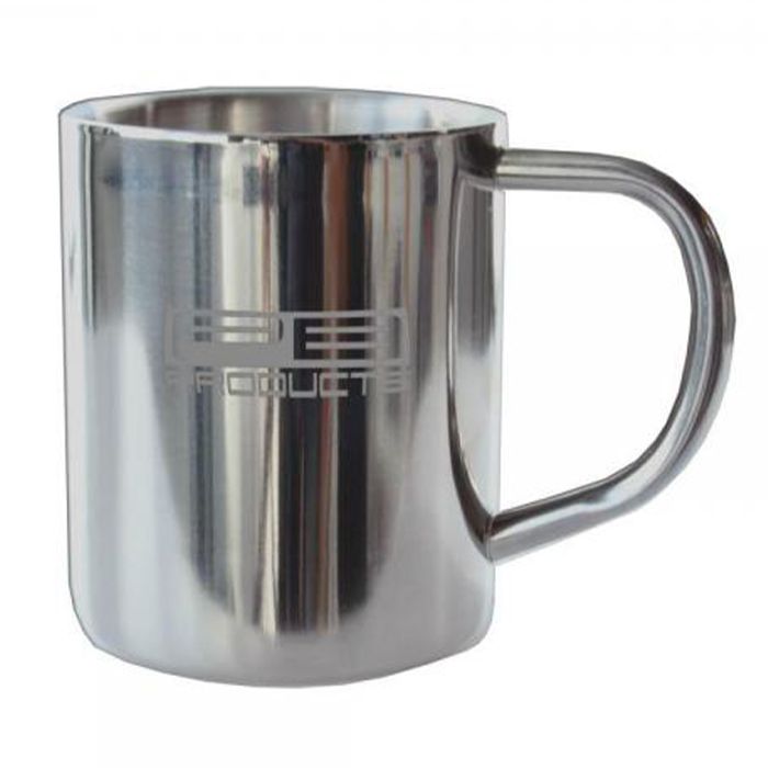 Een RVS dubbelwandige mok van 300ml. Robuust en sterk, door de dubbele wand is deze mok geïsoleerd en is deze gewoon vast te houden ondanks de hete drank. Tevens blijft de drank ook wat langer warm door deze dubbele wand. De mok is voorzien van een klein gegraveerd PB Products logo aan beide zijden. Deze mok blijft dus intact en zal logo of “kleur” zelfs niet verliezen tijdens het wassen in de afwasmachine. De inhoud van de mok is 300ml en de mok is voorzien van een ruim handvat.
