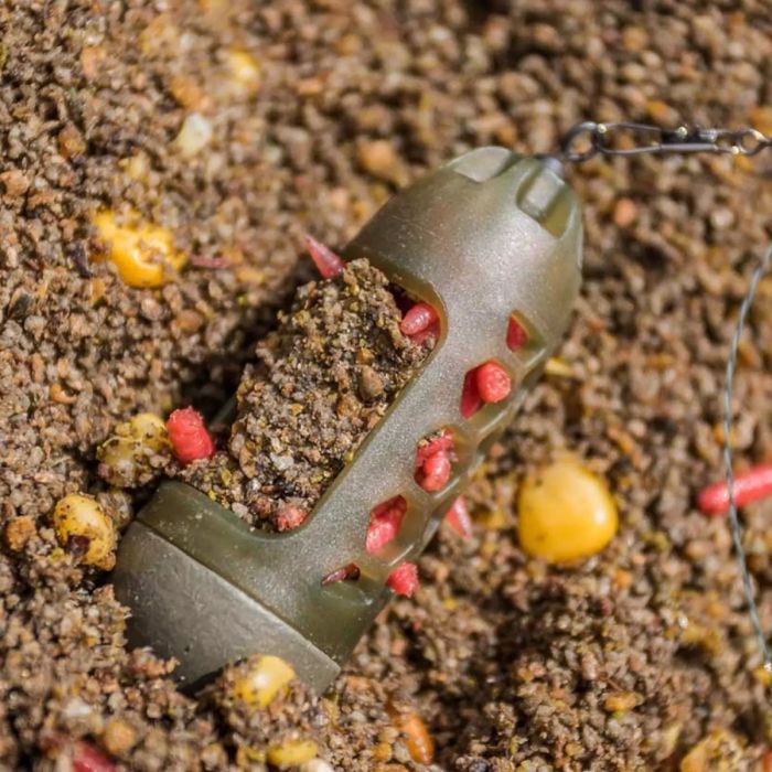 Om het aas weg te spoelen, heeft Preston een kleine hoek geplaatst op het lood dat zich in de feeder bevindt. Deze hoek is in de richting van het hoofdvenster, dus terwijl het water in de bovenkant van de feeder duwde, spoelde het het aas duidelijk uit het venster, precies op het moment dat je het oppakte. Met het gewichtgerichte ontwerp kunt u netjes grondvoer verder dan ooit introduceren voordat u een wolk door de waterkolom verlaat en vissen in de pen trekt.