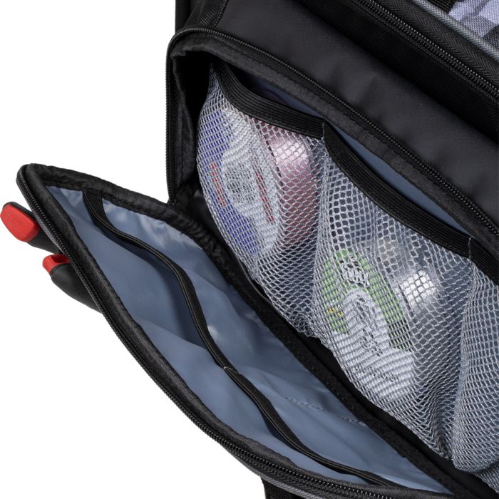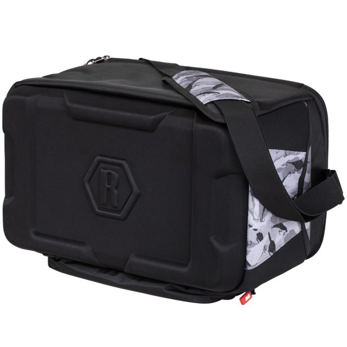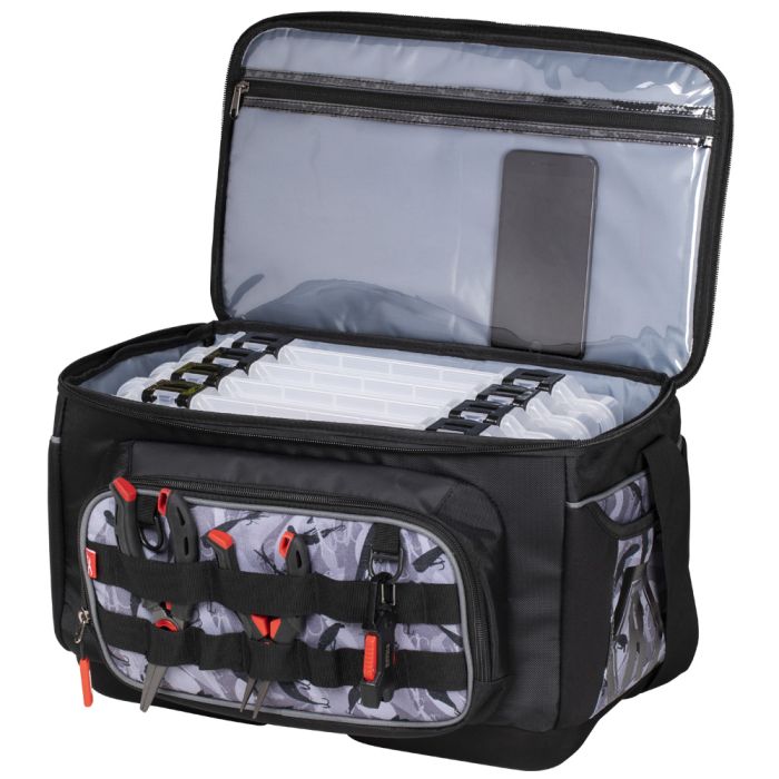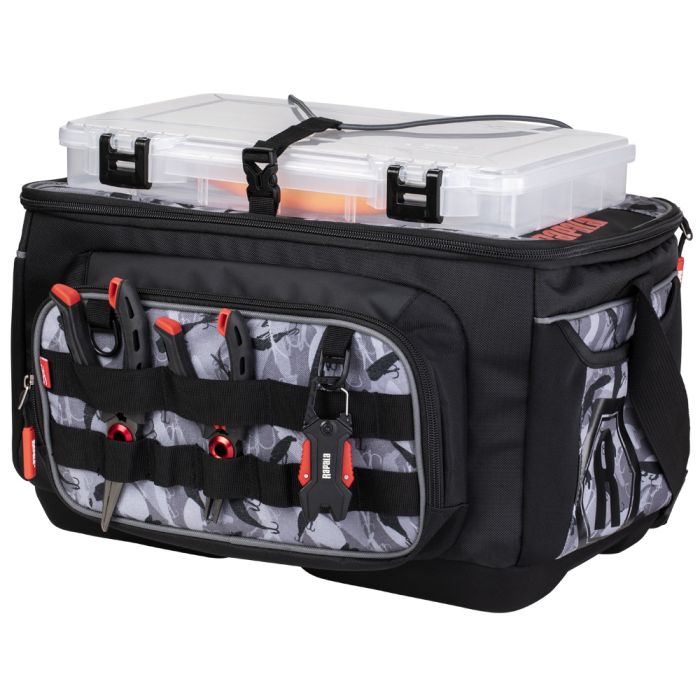Waterproof Rapala LureCamo-printed fabric with molded, waterproof EVA bottom to keep water out. Accommodates four Rapala 356 Tackle Trays inside the bag plus one on top for quick access. Front pocket features an eternal daisy chain for easy access tool storage and multiple organizer pockets. Zippered see-through pocket inside the lid. Neoprene panels on side pockets for extra capacity. Padded, adjustable shoulder strap. YKK zippers. Tackle boxes not included.