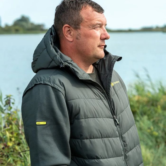 De ThermaPro Hybrid Jas is gemaakt van hoogwaardige materialen die ontworpen zijn om zelfs de meest uitdagende omstandigheden te weerstaan. De waterafstotende buitenlaag beschermt je tegen lichte regen en opspattend water, terwijl de geïsoleerde panelen je lichaam warm houden tijdens koude ochtenden en avonden. Het ademende ontwerp zorgt ervoor dat je niet oververhit raakt, zelfs als je actief bezig bent met het opzetten van je uitrusting of het bereiden van je aas.