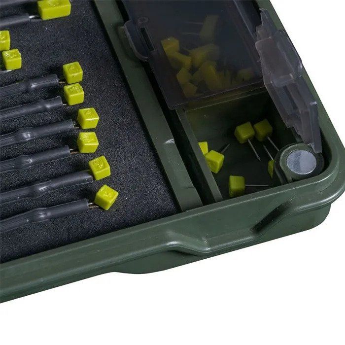 Bevestig eenvoudig de haak aan de rig-bar en houd je onderlijnen gestrekt door het andere uiteinde van je rig vast te zetten met de meegeleverde rig-pinnen. De Armory Rig Box heeft vier opbergvakken zodat je spullen bij de hand kunt houden, zoals hookbeads, boiliestops en/of wartels. De liniaal markeringen aan de bovenkant van de deksel helpt je elke keer om de perfecte rigs te maken.
