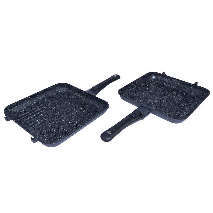 De Connect Pan & Griddle XXL Granite Edition is voorzien van afneembare cool-touch handgrepen en een afneembaar scharniersysteem dat van n pan twee pan maakt: een pan met platte bodem en een aparte grillpan. De Connect Pan & Griddle XXL wordt ook geleverd met een kaasrasp en een grote Q-Lock Spatel.