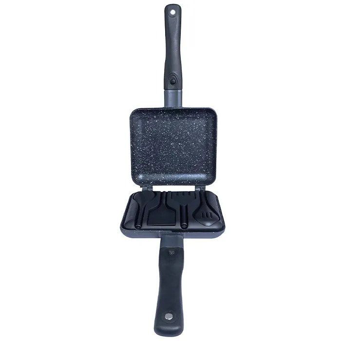 De RidgeMonkey Connect Sandwich Toaster Granite Edition is voorzien van afneembare cool-touch handgrepen, een afneembaar scharniersysteem dat n pan in twee verandert, en een volledige set keukengerei die samen met de handgrepen in de Toaster past, voor eenvoudig opbergen. De vierkante vorm betekent ook dat er minder opslagruimte wordt verspild dan bij traditioneel cirkelvormig kookgerei.