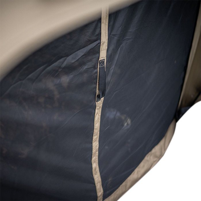 Het gaas is voorzien van een magnetisch 'doorgang functie' aan de voorkant en versterkte bevestigingspunten. De magnetische opening en sluiting zijn eenvoudig te gebruiken wanneer je met je handen door de bivak valt. Het betekent dat je er met je spullen doorheen kunt duwen en dat de gaasdeuren direct weer achter je sluiten.