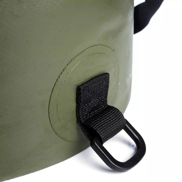Het legen van het water zal ook een gemakkelijke taak zijn, dankzij de klittenbandriemen. Er is ook een externe D-ring voor stabiel legen. Dit is geweldig voor wanneer u moet regelen hoeveel water u leegt of de druk van het water, vooral wanneer u uw vangst op de onthaakmat wat hydratatie moet geven. Je kunt de emmer uitgestrekt houden, vol water, zodat je bereid bent om het water te legen wanneer dat nodig is.