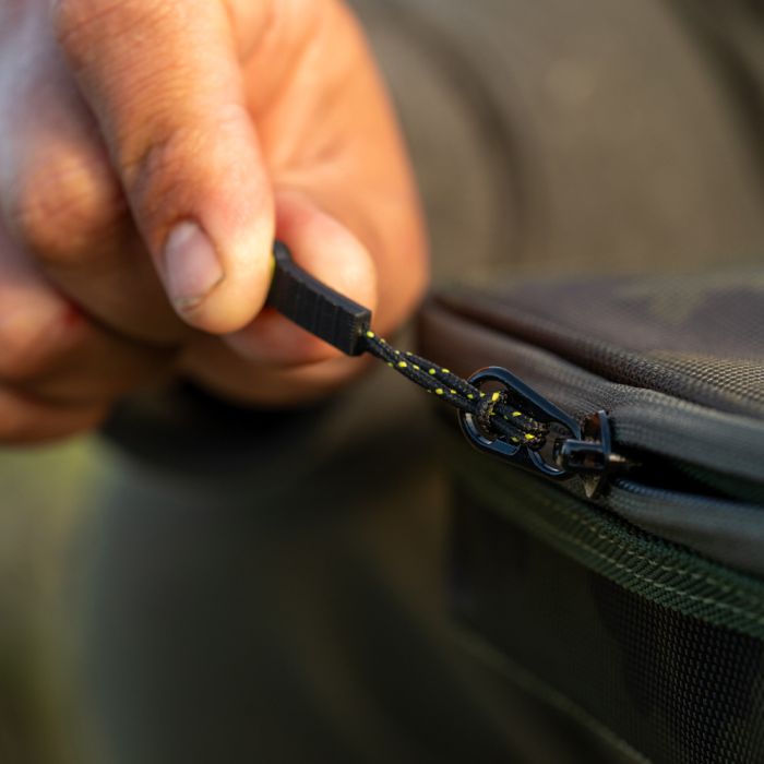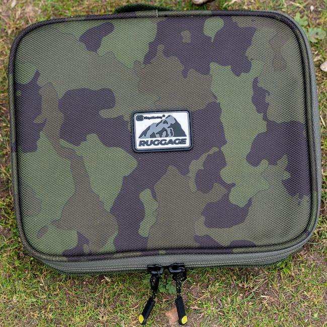 De koffer heeft stijve zijkanten, een gewatteerde voering aan de binnenkant en een binnenvak van mesh met ritssluiting in de deksel, afgewerkt in het unieke RidgeMonkey-camouflagepatroon.
