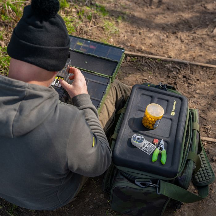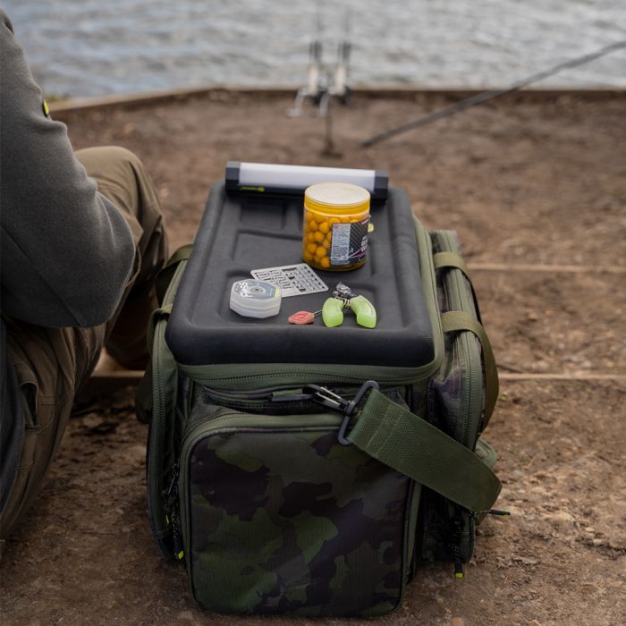 De tas wordt geleverd met een comfortabele schouderriem en aan elkaar te klikken ergonomisch ontworpen handgrepen, terwijl het voorzien is van een EVA gegoten deksel. De hardtop creëert een perfecte werkplek voor het knopen van rigs en het houden van je essentiële karper materiaal binnen handbereik.