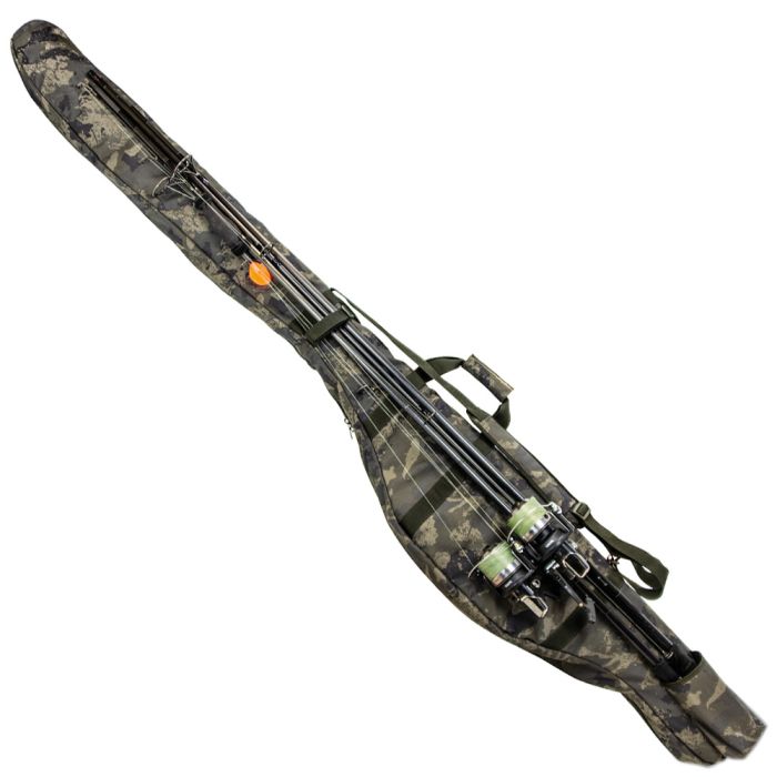 Our 3+2 Rod Holdall has been in much demand from our SP range, and so we have utilised the same design for our new UnderCover range. Made from 600D camouflaged, PU-backed material with all-round padding, this holdall will accomodate 3 made- up rods internally and 2 made-up rods externally. Both naked rods and single-rod sleeves can be attached to the outside of this holdall. Individual internal dividers and Velcro straps keep your rods safe and secure. There are two, partially-zipped external pockets with re-inforced bases for storing banksticks, storm poles, landing nets etc. It also features carry handles and adjustable, padded shoulder strap.