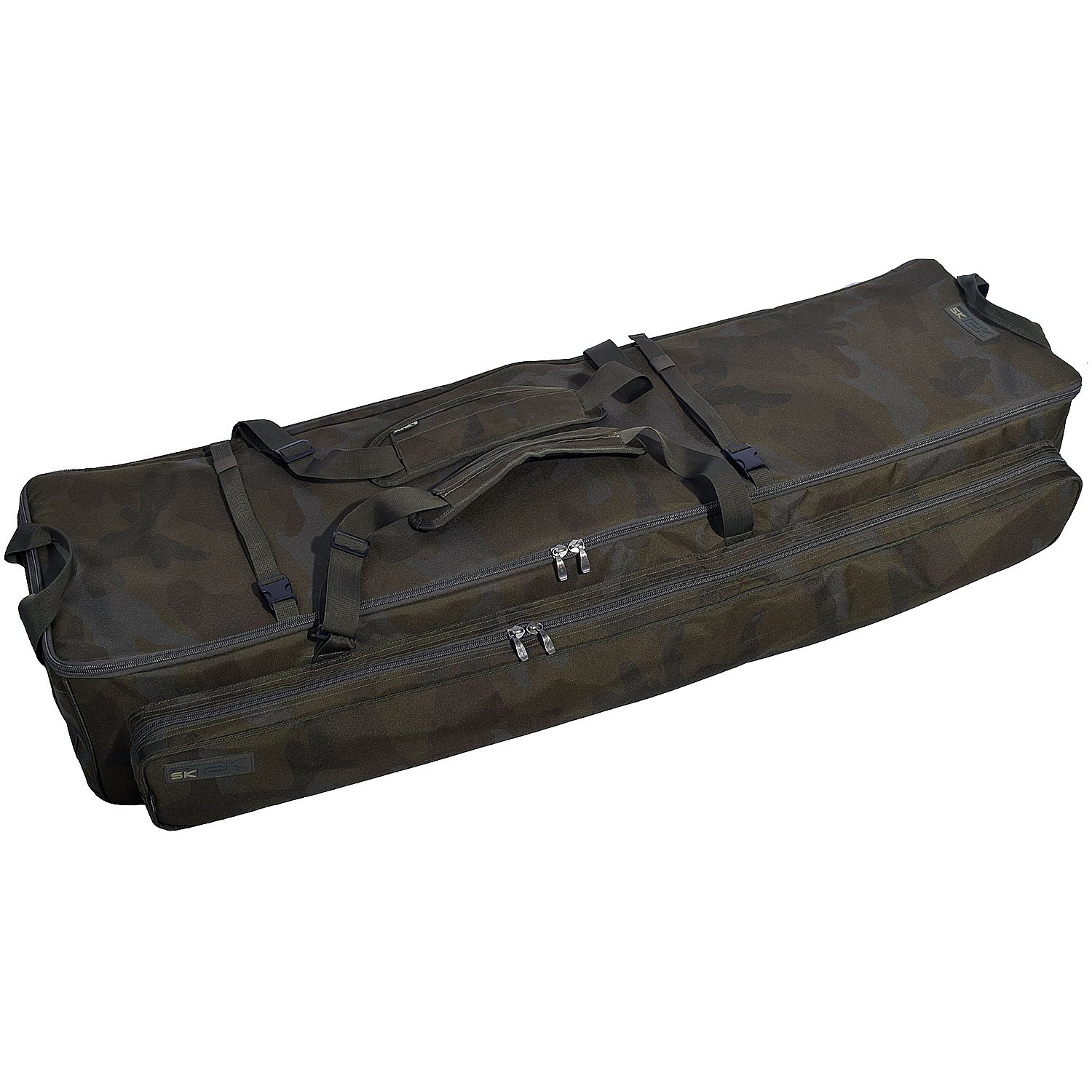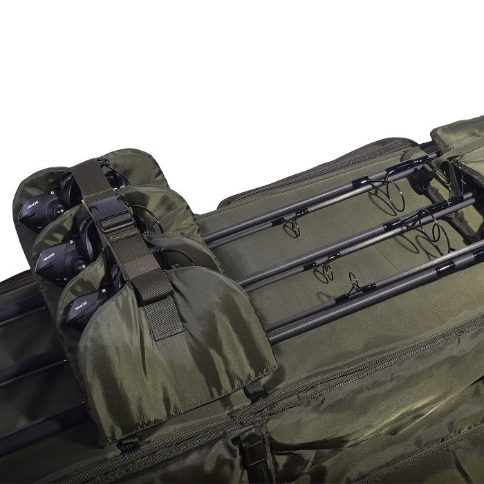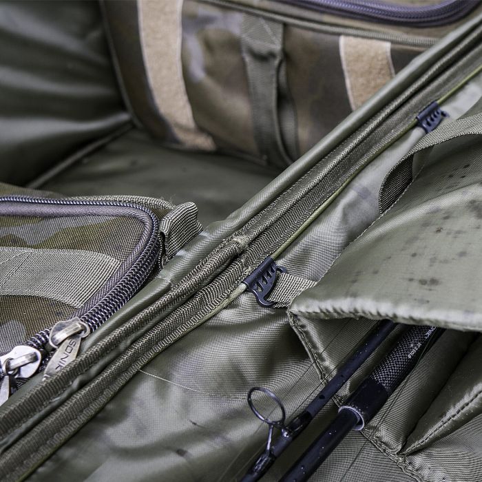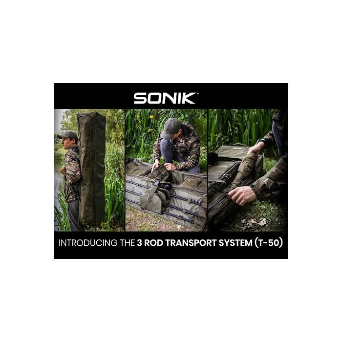 Sonik introduceert het ultieme 3-hengel transportsysteem. De afmetingen zijn zodanig dat er drie intrekbare karperhengels met 44 of 50 inpak lengtes in passen. Dankzij het intelligente, aanpasbare ontwerp accepteert het systeem stangen met verschillende handgreeplengtes. Door de hengels op het binnenste uitklapbare deksel te plaatsen, heeft u snel toegang tot uw uitrusting in de drie afneembare zakjes die perfect onder uw stretcher zijn opgeborgen. Het transportsysteem kan ook worden opgevouwen om het gemakkelijk op te bergen en is gemaakt van ons ultrasterke PVC-ondersteunde 600D SK-TEK camo-materiaal met een HD-waterdichte ondergrond. Er zijn ook twee bovenste compressiebanden voor extra accessoires en de draagbanden kunnen ook als rugzakharnas dienen.