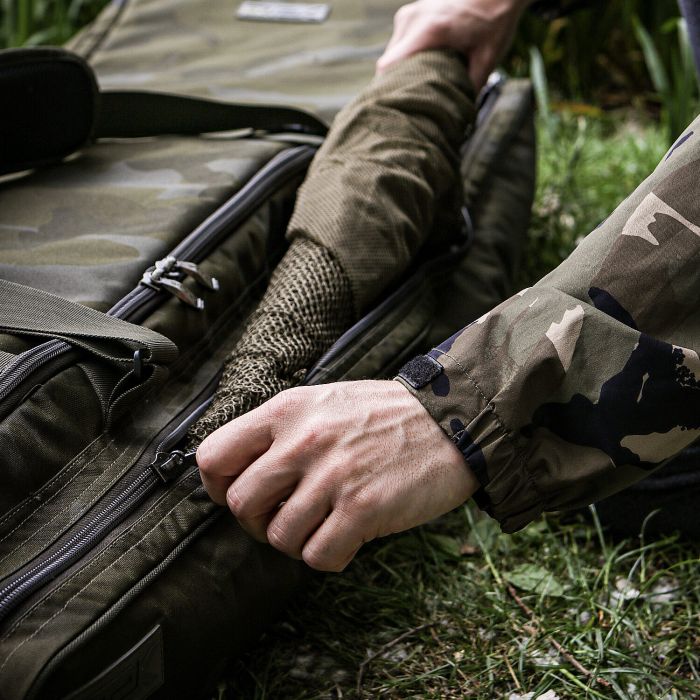 Sonik introduceert het ultieme 3-hengel transportsysteem. De afmetingen van deze tas zijn zodanig dat er drie intrekbare karperhengels met 44 of 50 inpak lengtes in passen. Dankzij het intelligente, aanpasbare ontwerp accepteert het systeem stangen met verschillende handgreeplengtes. Door de hengels op het binnenste uitklapbare deksel te plaatsen, heeft u snel toegang tot uw uitrusting in de drie afneembare zakjes die perfect onder uw stretcher zijn opgeborgen. Het transportsysteem kan ook worden opgevouwen om het gemakkelijk op te bergen en is gemaakt van ons ultrasterke PVC-ondersteunde 600D SK-TEK camo-materiaal met een HD-waterdichte ondergrond. Er zijn ook twee bovenste compressiebanden voor extra accessoires en de draagbanden kunnen ook als rugzakharnas dienen.