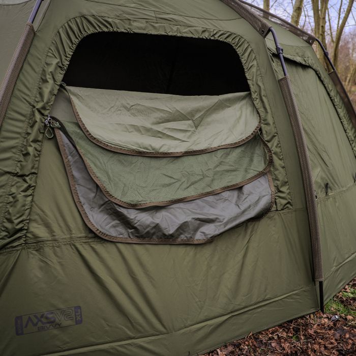 In navolging van het succes van de veelgeprezen AXS XL Bivvy is de AXS-V2 XL Bivvy gebouwd rond de supersterke AXS ALLOY centrale naaf en lichtgewicht anti-twist 6061aluminium frame, dat een ultrasnelle en superstabiele setup en quick pack down biedt. Bovendien is de AXS-V2 XL vervaardigd met behulp van ultrasterke extra versterkte palen met dubbele wanddikte in gebieden met hoge belasting. De luifel is geüpgraded naar onze nieuwe 16.000 mm HH Cloudbase-stof™ die sterk, licht en extreem waterdicht is. Het frame is gevormd met een hoge vlakke achterkant en steile zijkanten om maximale interne ruimte te bieden, ideaal voor de langere sessies in het VK of Europa. De AXS-V2 XL heeft ook de mogelijkheid om een binnencapsule te bevestigen die als afzonderlijk item verkrijgbaar is. De extra grote voorpiek met regendruppelbescherming biedt nog meer bescherming en heeft de perfecte maat om uw bedchair en al uw uitrusting tegen de elementen te beschermen. Een grote bonus voor de reizen naar het buitenland is de toevoeging van het 'clip in' of 'zip in' grondzeil dat ook is voorzien van een 'fold back door entry flap', waardoor het vloeroppervlak droog en schoon blijft. De bivvy beschikt ook over een zip on / off frontpaneel, compleet met mozzi zijruiten en volledig aanpasbaar voordeursysteem. Andere voordelen zijn onder meer interne voor- en achterzakken en groene / duidelijke voorportierraamopties, plus driewegopeningen aan de achterkant die vanaf de binnenkant van de bivvy kunnen worden geopend. Vier ontluchtingsstangen, een extra grote compressietas, twee 48" snelspannen, stormkoorden en een set zware T-haringen maken het pakket compleet. (De AXS-V2 XL Vapour Cap, AXS-V2 XL Inner Capsule en AXS-V2 XL Wrap zijn allemaal verkrijgbaar als afzonderlijke items.)