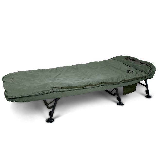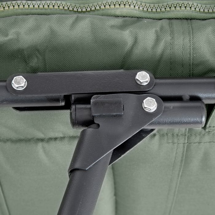 Een van de opvallende kenmerken van dit systeem is de robuuste bedchair. Het stevige stalen frame biedt maximale ondersteuning en duurzaamheid, zodat je lichaam volledig wordt ondersteund tijdens het slapen. De verstelbare poten met moddervoeten zorgen ervoor dat je het systeem stabiel kunt plaatsen, zelfs op oneffen terrein. Dit maakt het perfect voor vissers die op uitdagende locaties vissen waar een vlakke ondergrond moeilijk te vinden is.
