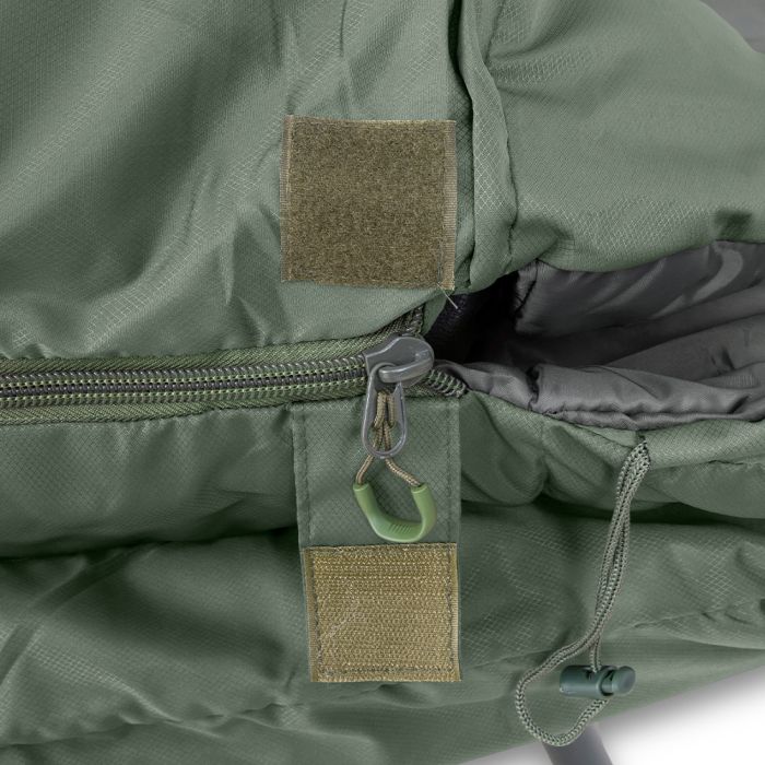 De slaapzak is voorzien van heavy-duty ritsen aan beide zijden, wat snelle toegang en eenvoudige ventilatie mogelijk maakt. Dit is vooral handig als je 's nachts snel moet reageren op een beet of als je de temperatuur wilt aanpassen tijdens warmere nachten. De elastische bevestigingslussen houden de slaapzak stevig op zijn plaats, zodat je je geen zorgen hoeft te maken over verschuiving tijdens het slapen.