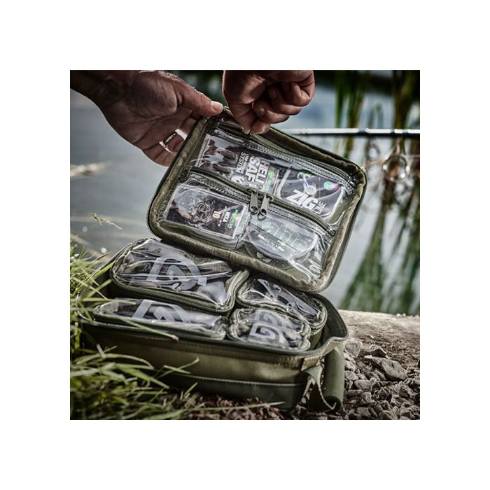 De binnenkant van het etui is voorzien van PVC-vakken met ritssluiting, naast de afzonderlijke loodzakken, die perfect zijn voor het opbergen van andere kleine accessoires. Met een afveegbare EVA-basis kun je dit zakje zonder nare gedachten op de oever naast je gooien in het slechtste weer en snel opruimen als het tijd is om naar huis te gaan.