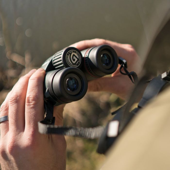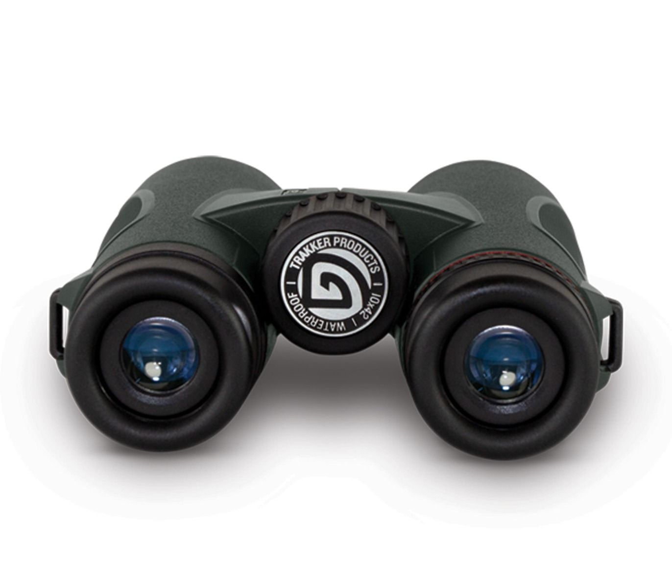 De Trakker Optics zijn voorzien van draai- en klikbare rubberen oogschelpen die de ogen gemakkelijk op het juiste punt kunnen plaatsen - vooral handig voor mensen die een bril dragen. Gebouwd met een solide frame met een structuurrubberen afwerking voor een geruststellende grip en duurzaamheid. Het grote centrale rubberen scherpstelwiel is gemakkelijk te vinden met uw vingers, zelfs als u handschoenen draagt, zodat u de scherpe scherpstelling kunt instellen vanaf een afstand van 2,5 m tot zover het oog kan zien.