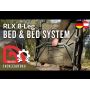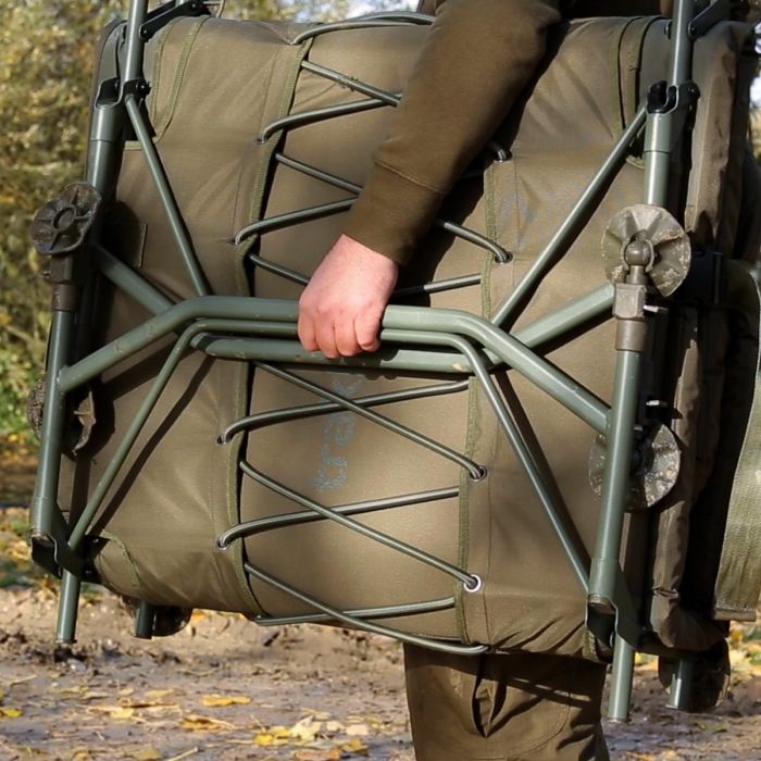 De stretcher heeft verstelbare poten met een minimale hoogte van 42 cm en een maximale hoogte van 57 cm. Deze poten hebben dan roterende modderpootjes voor een optimale verdeling van de belasting en voor vissers op oneffen oevergebied. De stoel kan gemakkelijk worden gesloten om op te bergen dankzij de dubbele scharniertechnologie, waardoor de slaapzak in opgeklapte toestand aan het bed blijft vastzitten.