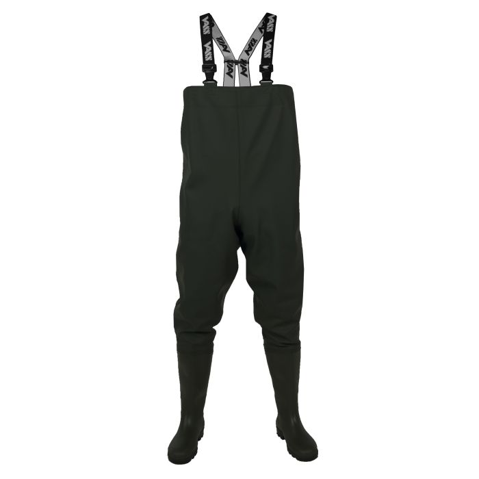 Deze Vass 600 PVC Borstwader met noppen zijn voorzien van een stevige Wellington laars die een stevige grip biedt op een reeks van oevergebieden. Ze hebben brede, elastische bretels voor comfort en bewegingsvrijheid, en zijn gemaakt van Vass 600 PVC/polyester mix materiaal, wat een duurzame afwerking geeft, en een set van waders creëert die is ontworpen om de eisen van de hengelsport levensstijl aan te kunnen, hoe actief je ook wilt zijn. De noppenzolen op de laarzen zorgen voor een betrouwbare grip op natte rotsen, glad gras, en elke meerbedding.