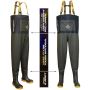 Vervaardigd met betrouwbare viervoudig gelaste naden en voorzien van de super taaie en gripvaste Vass E laarzen. Er is een externe waterdichte borstzak met rits, en een binnenzak om enkele benodigdheden mee te nemen.