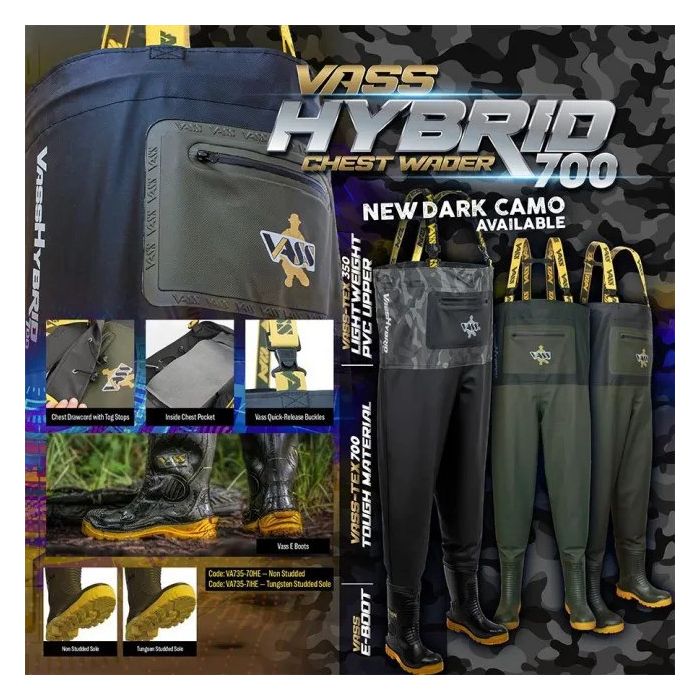 **Wat is het Vass Hybrid 700 Dark Camo Chest Waadpak Non-Studded?**
