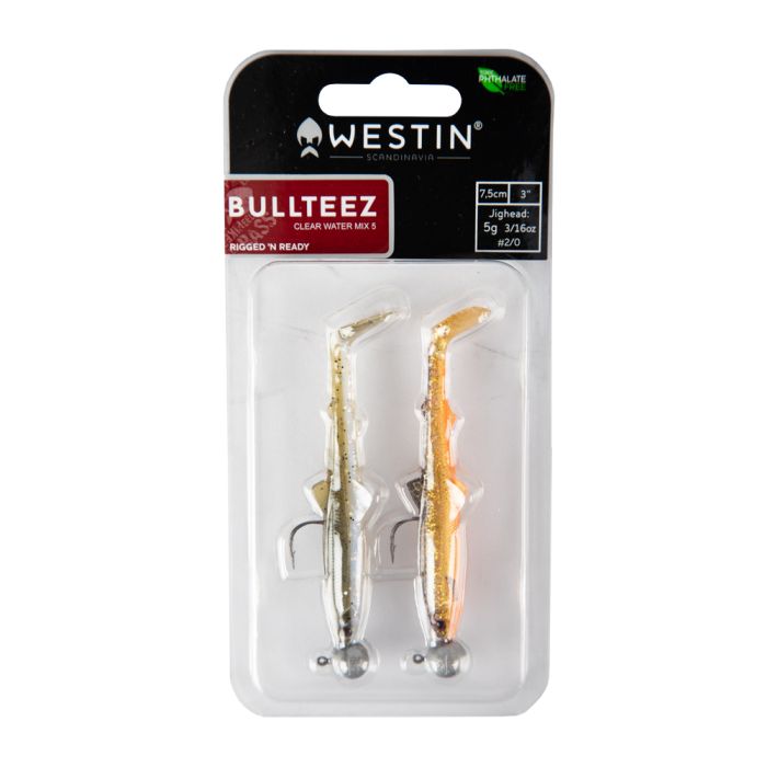 Westin Bullteez R 'N R Clear Water Mix 5 Lures, Want to catch a big one? Then the BullTeez R 'N R is the ultimate choice for big predators like pike and zander. The shad tail in combination with a slender wrist creates a seducing wriggling and belly-flashing action – even at low speed. Just this wriggling movement attracts and fools the really big fish into attacking the lure. BullTeez can easily be fished with shallow rigs or right down in the depths with a regular jig head. For weedless presentation with a big offset hook we have equipped the BullTeez with slots on belly and back. Perfect for fishing into the reeds!