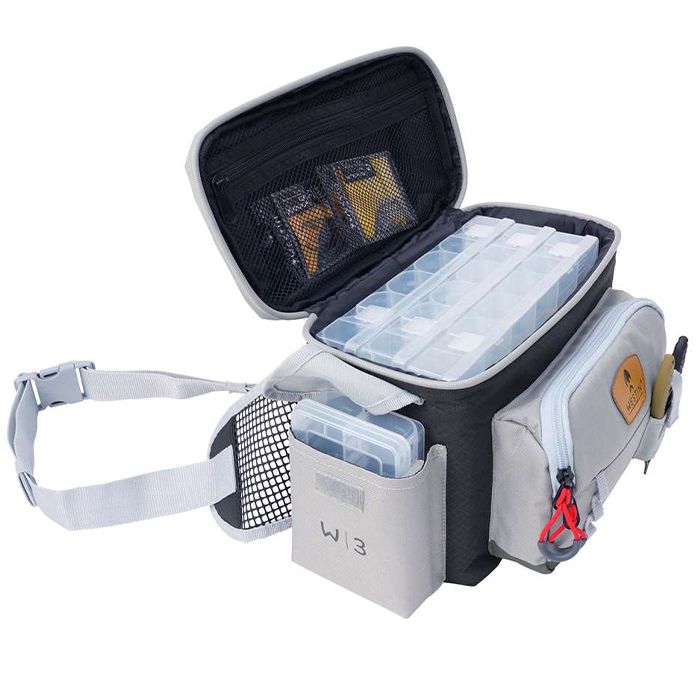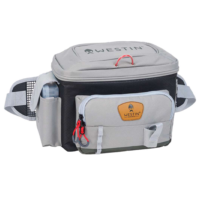 Westin W3 Grote Grijze / Zwarte Heuptas Plus 4 Dozen, Draag het rond je taille en houd al je visspullen dicht bij je. De W3 Heuptas bevat kunstaasdozen en het hoofdcompartiment heeft een snel en gemakkelijk magnetisch openingssysteem. Deze tas heeft meerdere zakken, een klittenband gereedschapsriem en een groot gaasvak in de tas.